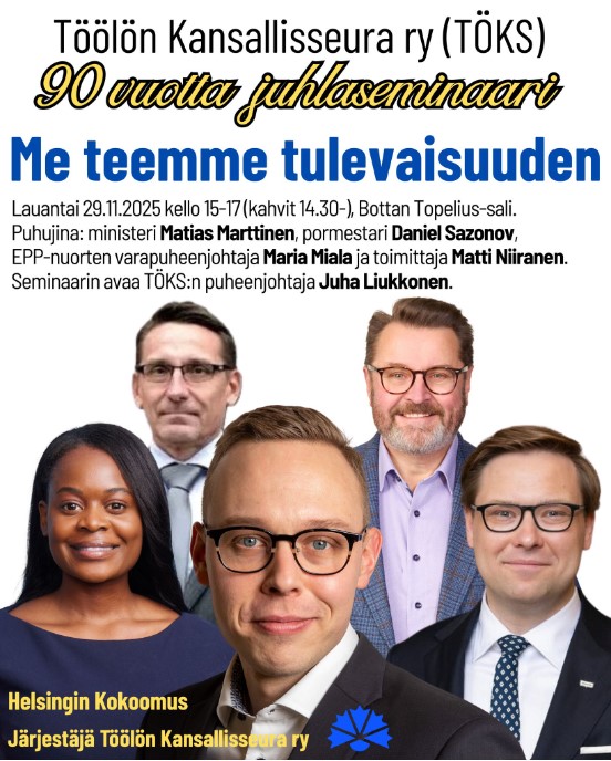 Töölön Kansallisseura ry perustettiin marraskuussa 1935. Sen johdosta meillä on ilo kutsua Sinut juhlaseminaariin ja illanviettoon lauantaina 29.11.2025 Bottalle Topelius-saliin. Tämä on avec-kutsu. Olet alustavasti ehkä jo puhelimitse kertonut osallistumisestasi. Ole ystävällinen ja vahvista osallistumisesi tällä lomakkeella Lomakkeella vastaat tuletko mukaan sekä seminaariosuuteen että illallisosuuteen, vaiko vain jompaankumpaan. Mahdollisiin kysymyksiisi tilaisuudesta vastaa yhdistyksessämme Anja Järvinen, puh. 040 562 5168 (anja.jarvinen@salnet.fi). Juhlaseminaarin ohjelma on alla olevassa liitteessä. Olemme saaneet hienon kattauksen puhujia: Tarjoamme kahvit+makean kahvileivän alkaen klo 14.30. Seminaari käynnistyy klo 15 ja illallinen alkaa noin klo 17.30. Illalliskortti hinnaltaan 70 euroa maksetaan etukäteen 5.11.2025 mennessä yhdistyksen tilille FI80 1023 3000 2022 88. Tule hakemaan valoa marraskuuhun, energiaa kohtaamisista ja kiinnostavista puheenvuoroista. Lämpimästi tervetuloa!